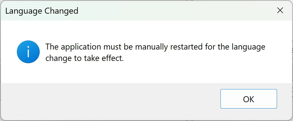 You must restart Tabular Editor 3 for language changes to take effect. The application prompts you to restart but does not restart automatically. Save your work before changing the language.